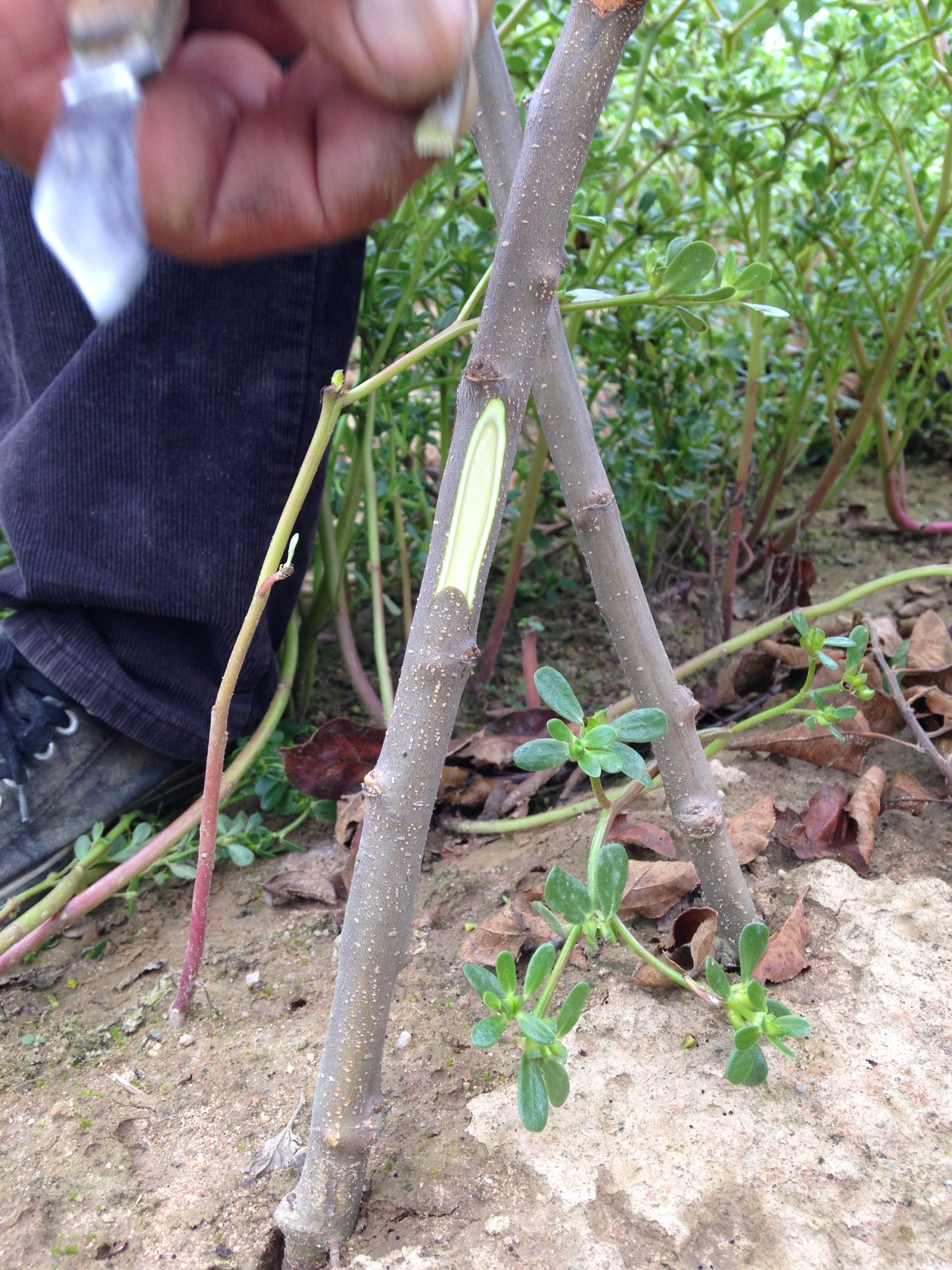 - On positionne le greffon avec une légère pression pour le caler tout au fond de l’encoche, afin que le cambium du greffon soit en contact avec celui du sujet.
